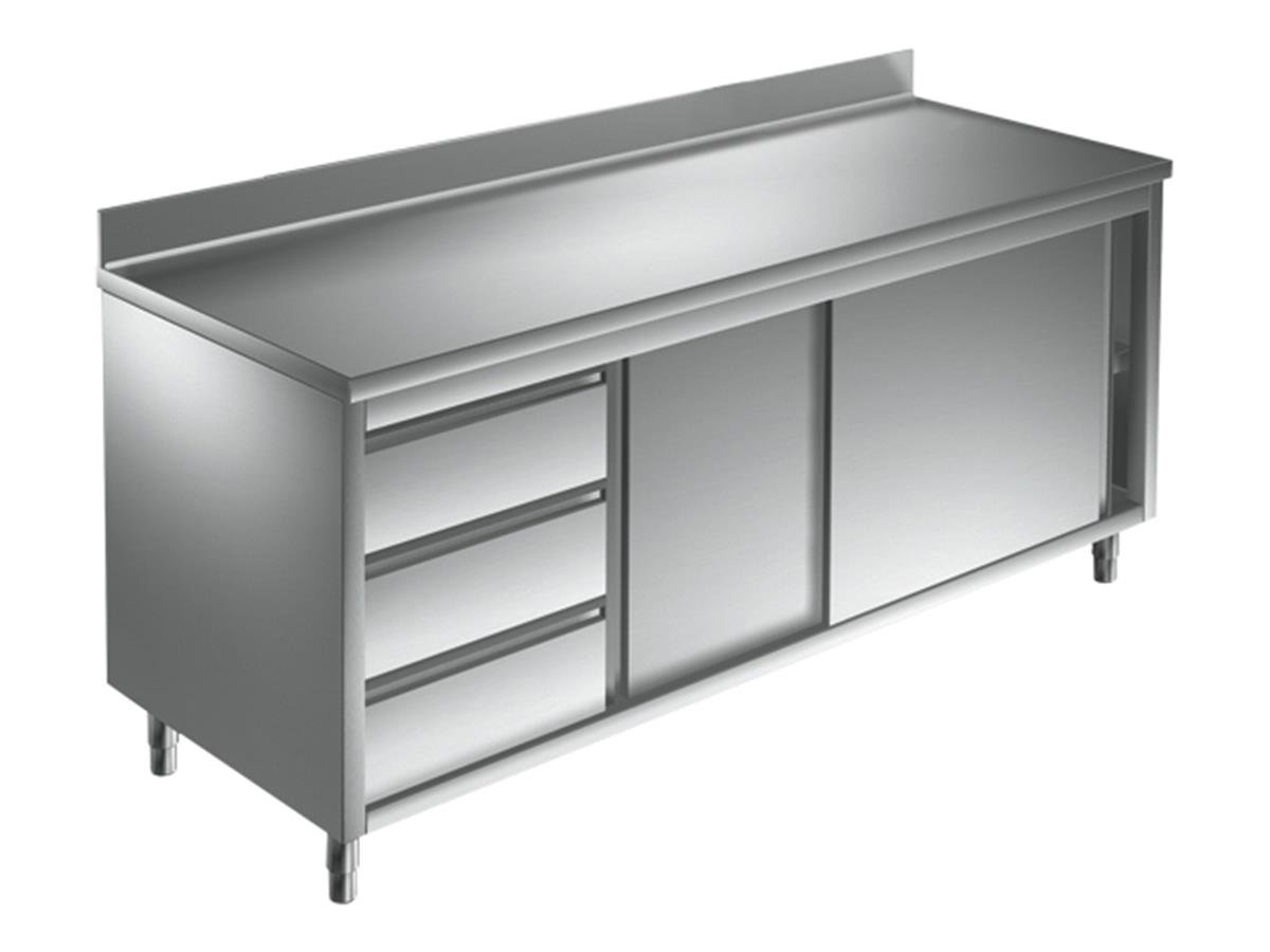 Qualität aus Deutschland - Neuware - 1 höhenverstellbarer Zwischenboden - mit Aufkantung 10 cm - Edelstahl Arbeitsfläche mit Holzplatte verstärkt - Lärm- und wasserisolierte Arbeitsplatte - 3 Schubladen links - Schubladen Innenmaß (BxTxH): 33 x 43,8 x 10,3 cm - Standfüße um ca. 5 cm in der Höhe verstellbar - Schiebetüren - Material: Edelstahl AISI430