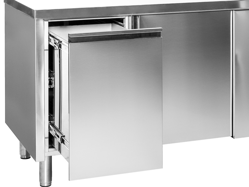 Edelstahl Arbeitsschrank ohne Aufkantung, mit Abfallbehälter und Flügeltür