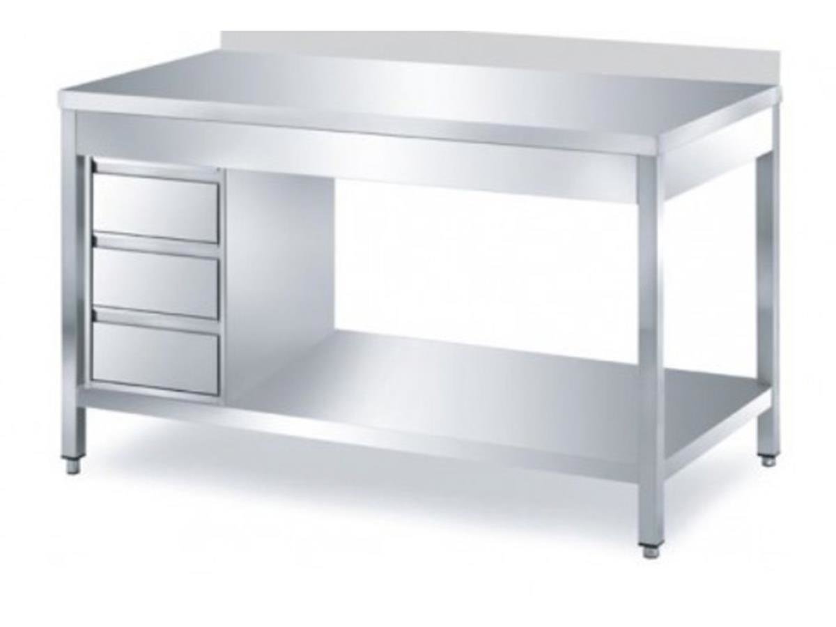 Qualität aus Deutschland - Neuware - mit Grundboden - mit Aufkantung - Edelstahl Arbeitsfläche mit Holzplatte verstärkt - Lärm- und wasserisolierte Arbeitsplatte -Tischbeine mit Vierkant Profil - 3 Schubladen links - Schubladen Innenmaß (BxTxH): 33 x 43,8 x 10,3 cm - Beine um ca. 5 cm in der Höhe verstellbar