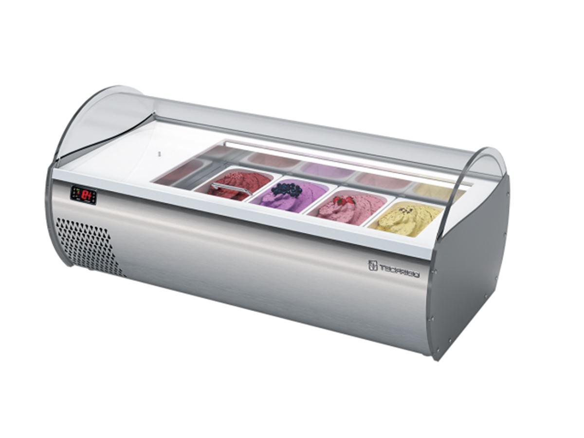 Die Wanne ist berohrt um eine gleichmäßige Kälte zu erreichen. Der formschön gebogene Aufbau aus durchsichtigem Kunststoff und Hebedeckel mit Griff aus lassen einen optimalen Blick auf die Ware zu. Weiterhin wird durch die LED-Beleuchtung die Ware in den Vordergrund gestellt. Das Gerät kann mit 2x 5 Liter. Eisschalen mit den Maßen 360x 165 x 120 mm oder mit 2x 7 Liter Eisschalen mit den Maßen 360x165x150 mm ausgerüstet werden. Die Eisschalen sind nicht im Lieferumfang enthalten.