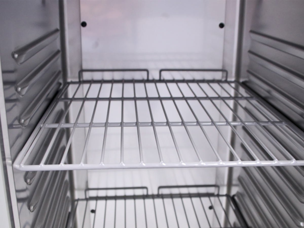 Innenraum mit vorgeformten Auflageschienen zur Einbringung von maximal 24 Rosten GN 2/1 in einem Abstand von 55 mm. Tiefgezogener Innenboden mit abgerundeten Ecken als Wanne ausgebildet für maximale Hygiene. Türen mit Schloss und eingelassener Griffleiste, unter 100° selbstschließend.