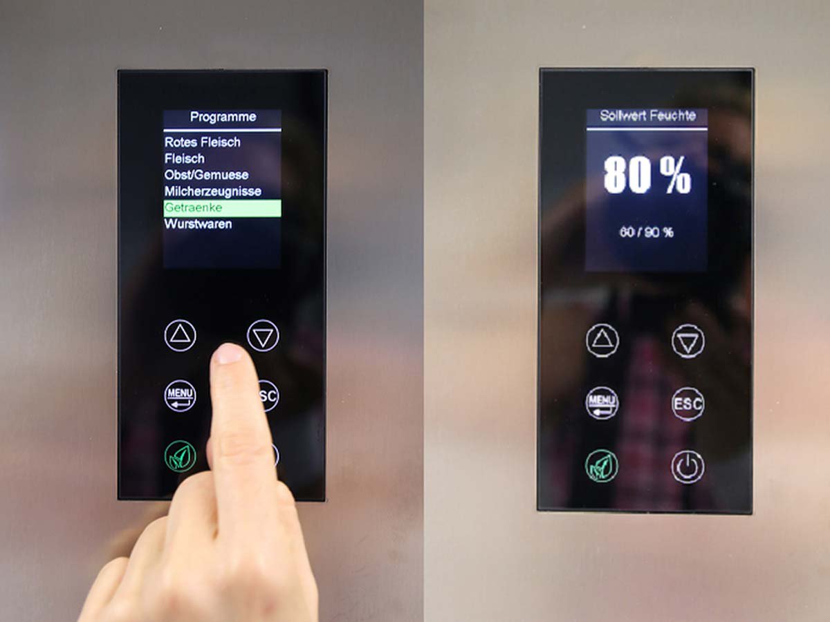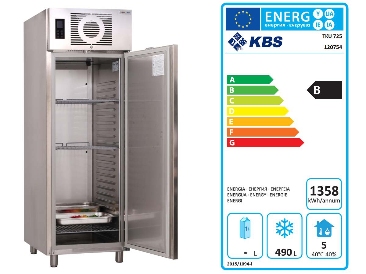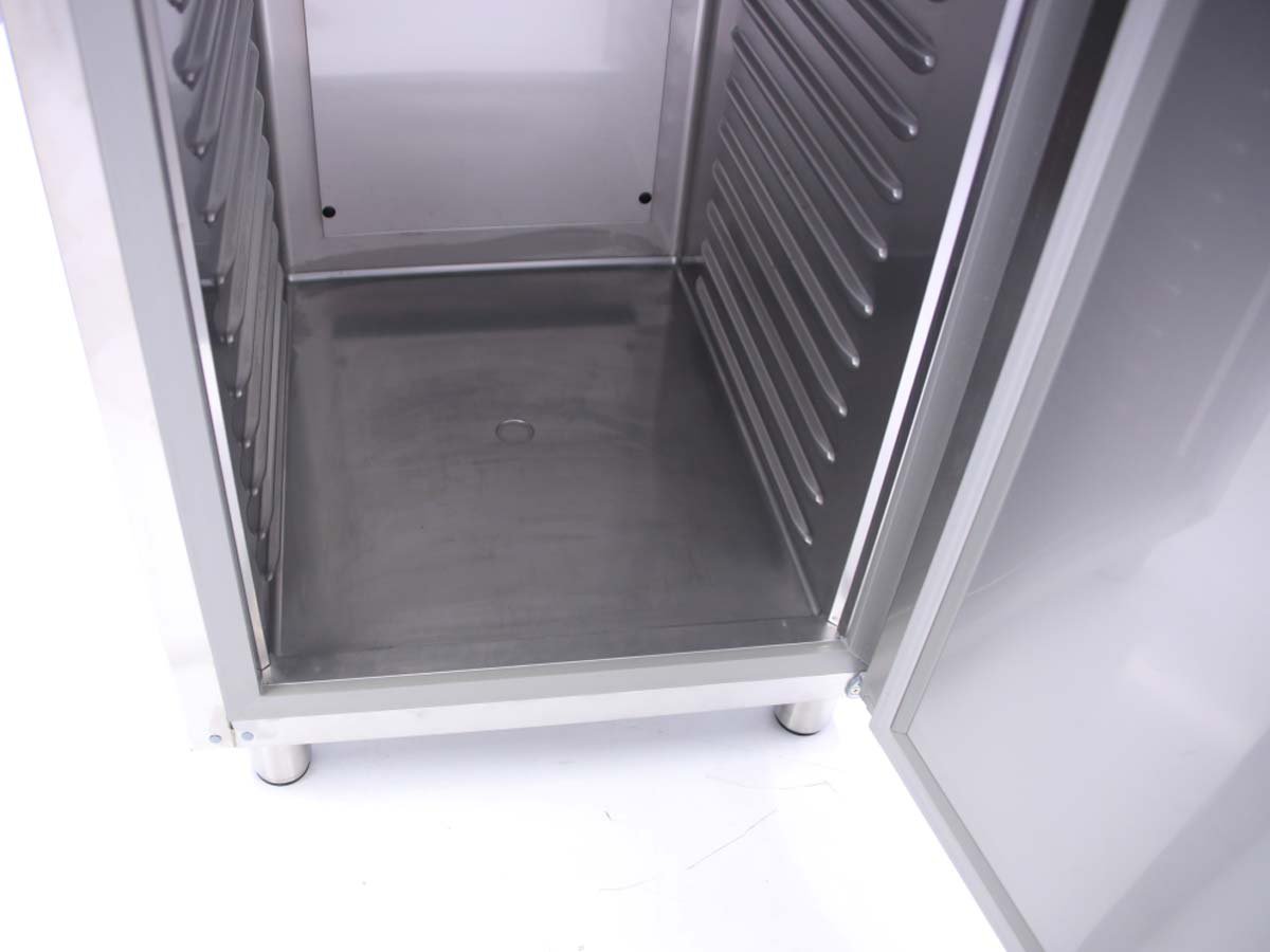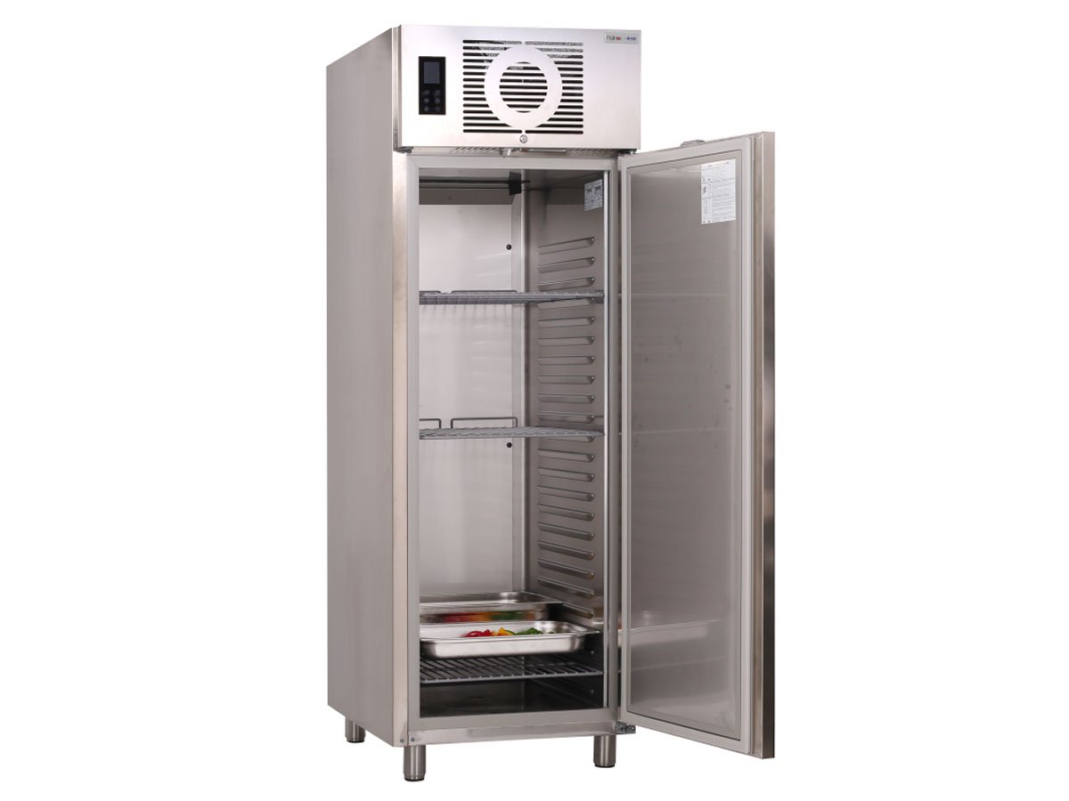 in Monoblockbauweise gefertigt mit bis zu 94mm Energiespar-Isolierung FCKW-frei und umweltfreundlichem Kältemittel R290. Außenmaterial dreiseitig Edelstahl CNS 18/10 AISI 304 Scotch-Brite verschliffen. Bedienung über mehrsprachiges Touch-Screen für Temperatureinstellung, Rezeptbuch, Feuchtigkeitseinstellung, HACCP, RTC (Real Time Clock) und ECO-Funktion. Die Vorteile für den Nutzer, großes Display an dem die momentane Kühlraumtemperatur schnell und ohne Mühe abgelesen werden kann. Ebenfalls sind die einzelnen Einstellungen auf dem Touch-Screen sichtbar, hierzu zählen ausgewähltes Programm, eingestellter Energie-Saving-Modus, das Kühl-/und Lüftersymbol zeigt den momentanen Betriebsstatus an. Nicht zuletzt ist der Kühlschrank noch mit einer Türüberwachung ausgerüstet, der zeitgesteuert einen Summer aktiviert wenn die Tür zu lange geöffnet ist. Maestro Software-System on Board, das System erlernt selbständig Ihre Arbeitsgewohnheiten und führt zum Beispiel automatisch einen bedarfsgerechten Abtauzyklus aus oder setzt das Gerät in den Standby Modus um zusätzlich Energie einzusparen. Monoblocksystem und Verdampfer freier Innenraum für maximale Ausnutzung der Kühlfläche mit Luftleitschienen für eine optimale Kühlung des Innenraums durch indirekte Belüftung. Innenraum mit vorgeformten Auflageschienen zur Einbringung von maximal 24 Rosten GN 2/1 in einem Abstand von 55mm. Tiefgezogener Innenboden mit abgerundeten Ecken als Wanne ausgebildet für maximale Hygiene. Tür mit Schloss und eingelassener Griffleiste unter 100° selbstschließend mit oberen Schleppscharnier. Unteres Türscharnier nach vorne montiert, hierdurch kann der Gewerbe-Kühlschrank für eine Sockelbaumontage verwendet werden. Side by Side Montage von weiteren Kühlschränken möglich, da die Türen im geöffneten Zustand nicht überstehen. Hohe Servicefreundlichkeit durch klappbare Maschinenfachblende, Kondensator mit Fettfilter und Türmagnetsteckdichtung. Automatische energiesparende Abtauung und energiesparende Heißgas-Tauwasserverdunstung sowie LED Innenbeleuchtung. Höhenverstellbare CNS-Ausgleichsfüße 150 mm bis 175 mm verstellbar. Ein europaisches Markenprodukt aus dem Hause friulinox.