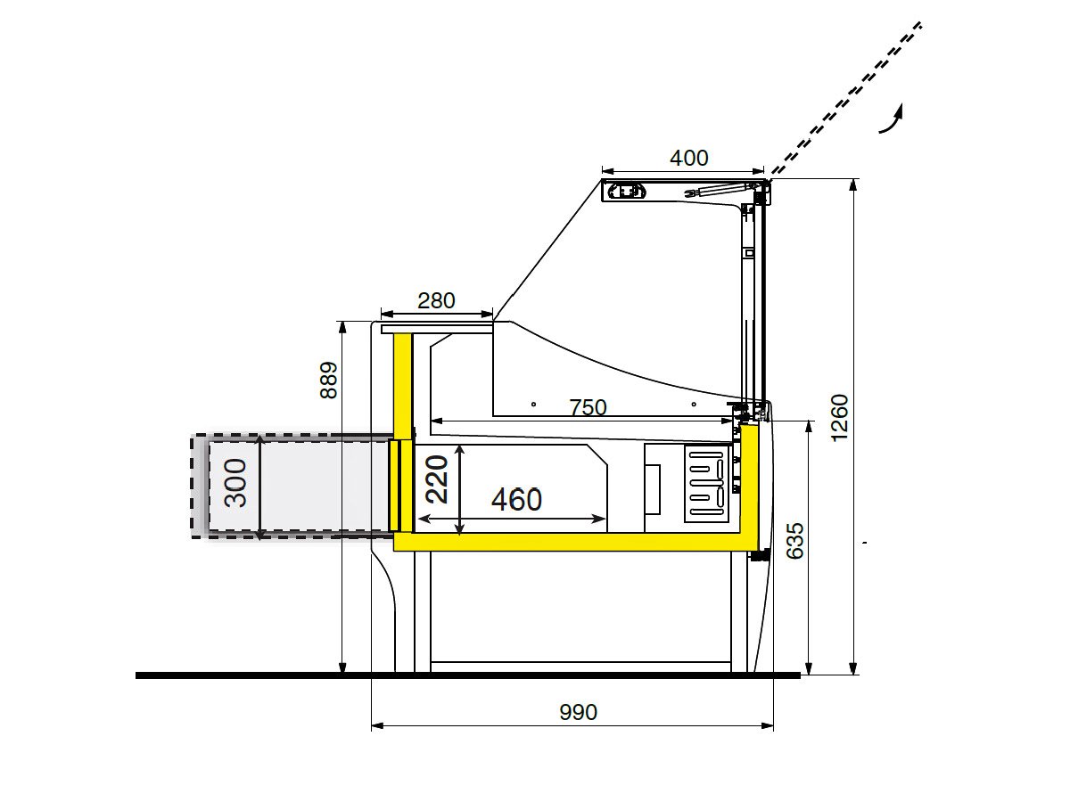 Die Granitarbeitsplatte der Kühltheke hat eine Tiefe von 280 mm. Ferner verfügt die Kühltheke über eine 400 mm große Zahlplatte. Die Ausstellungsfläche ist aus CNS (AISI 304) gefertigt mit einer Tiefe von 750 mm. Zusätzlichen Stauraum bietet die Kühltheke über ein Reservefach.