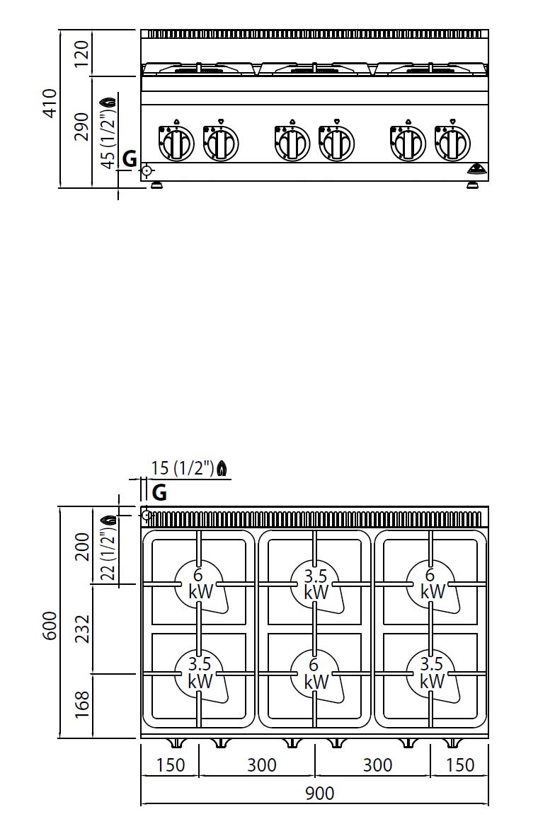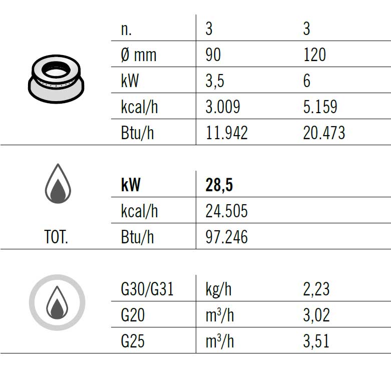 6 Brenner 28,5 kW, 3x 6 KW + 3x 3,5 KW