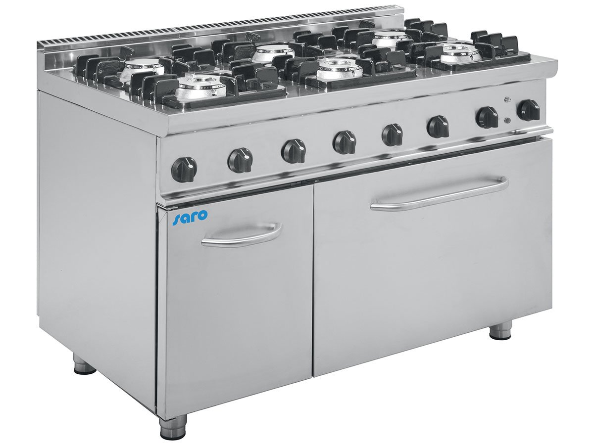 - 6 Brenner Gas-Herd mit übergroßem 120 Ltr. Elektrobackofen (2/1 GN)