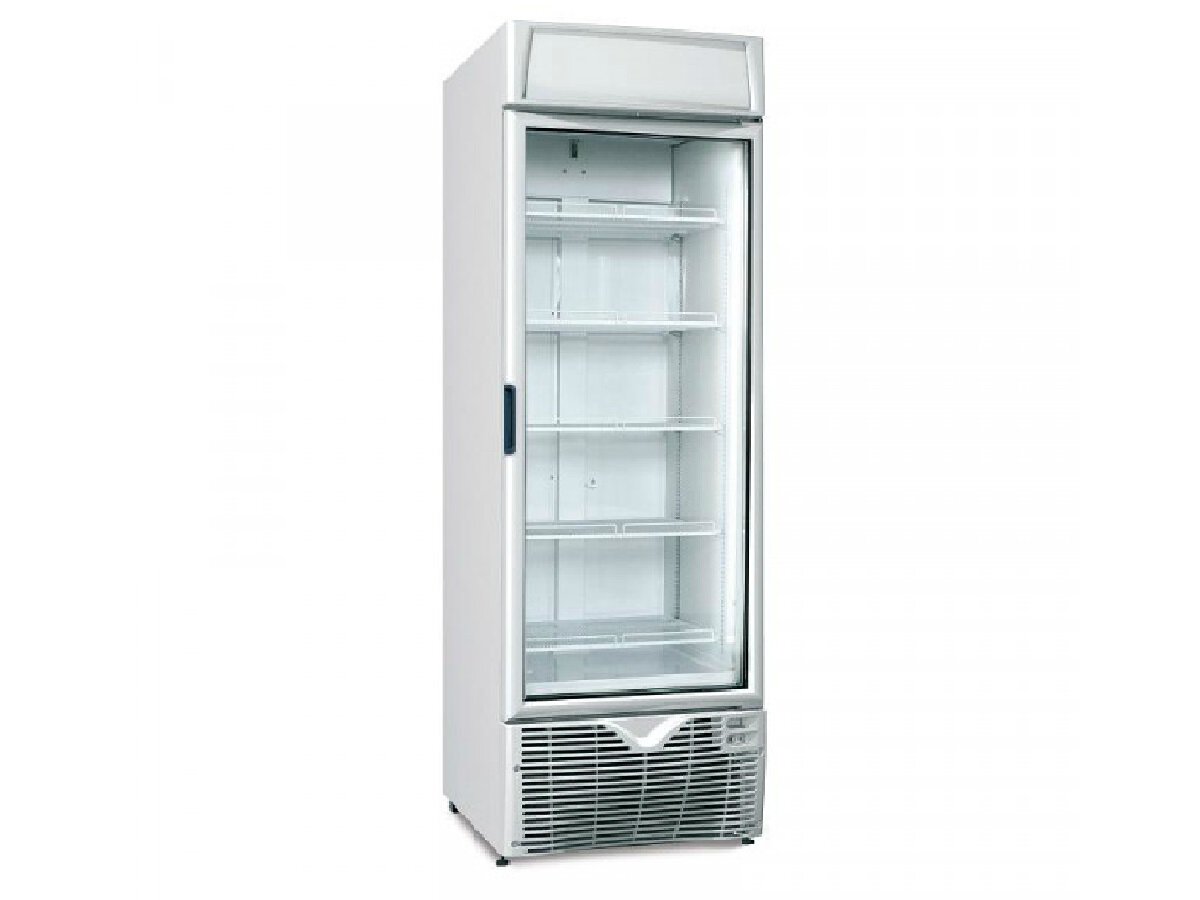 Umlufttiefkühlschrank mit beheizter Glastür. Aluminiumtürrahmen mit integriertem Griff, Displayrahmen und Maschinenfachblende in grau. Der Inneraum wird durch zwei vertikale Leuchstoffröhren gut ausgeleuchtet.