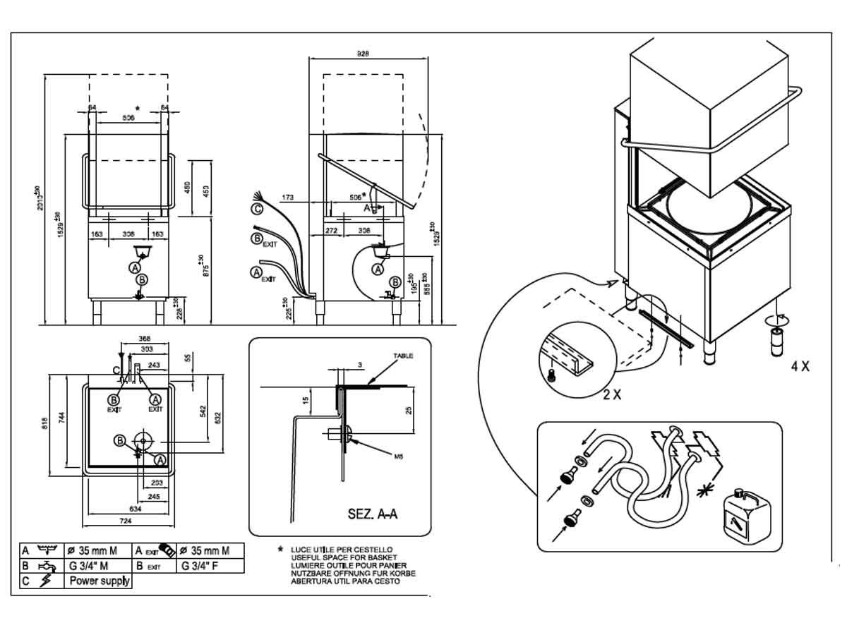 Der gesamte einwandig konzipierte Korpus besteht aus Edelstahl. An der Klappe befindet sich ein Sicherheitsmikroschalter, der das Programm beim Öffnen automatisch stoppt. Weitere Merkmale sind unabhängige Spül- und Klarspülarme oben und unten, Schmutzfangsiebe und Spül- und Nachspülsystem.