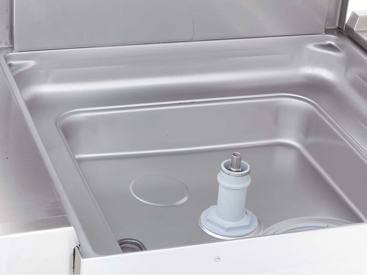 Der gesamte einwandig konzipierte Korpus besteht aus Edelstahl. An der Klappe befindet sich ein Sicherheitsmikroschalter, der das Programm beim Öffnen automatisch stoppt. Weitere Merkmale sind unabhängige Spül- und Klarspülarme oben und unten, Schmutzfangsiebe und Spül- und Nachspülsystem.
