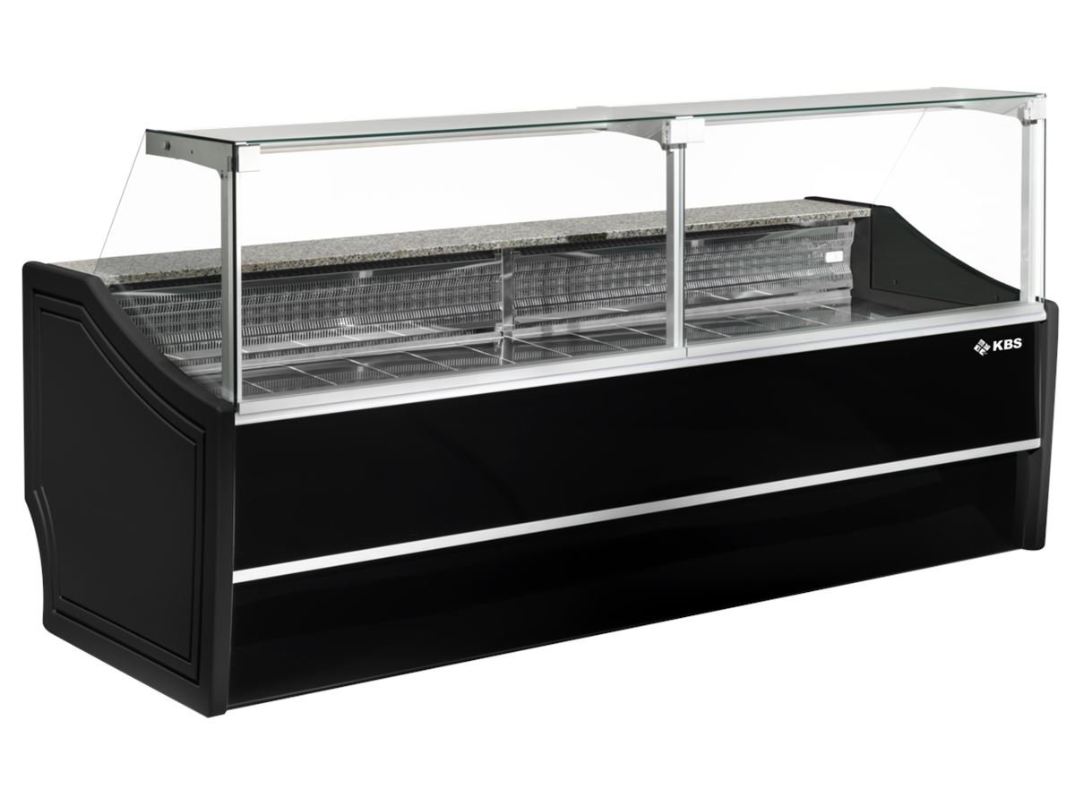 Kühltheke Delio mit stiller Kühlung, gerader Fronthebescheibe aus Sicherheitsglas und Hebedämpfer. Die Kühltheke verfügt über eine elektronische Steuerung mit digitaler Temperaturanzeige und einer separat schaltbaren Auslagenbeleuchtung.