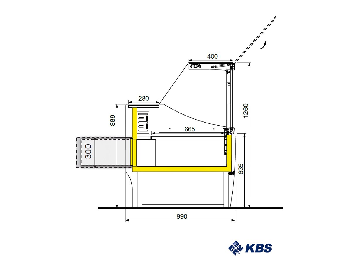 Die Ausstellungsfläche ist aus CNS (AISI 304) gefertigt mit einer Tiefe von 665 mm. Zusätzlichen Stauraum bietet die Kühltheke über ein Reservefach.