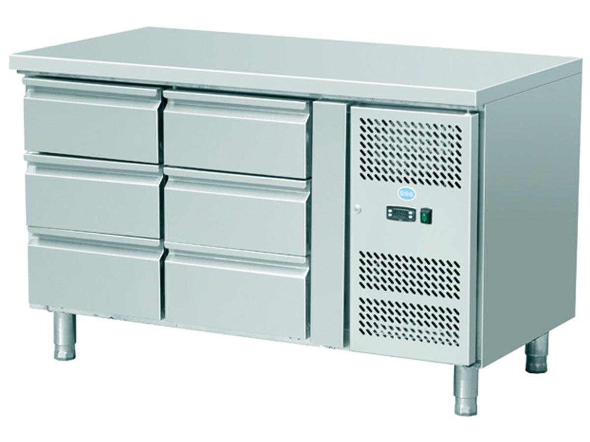 Kühltisch ohne Aufkantung, 6 Schubladen, Inhalt: 282 Liter, 1355 x 700 x 860 mm