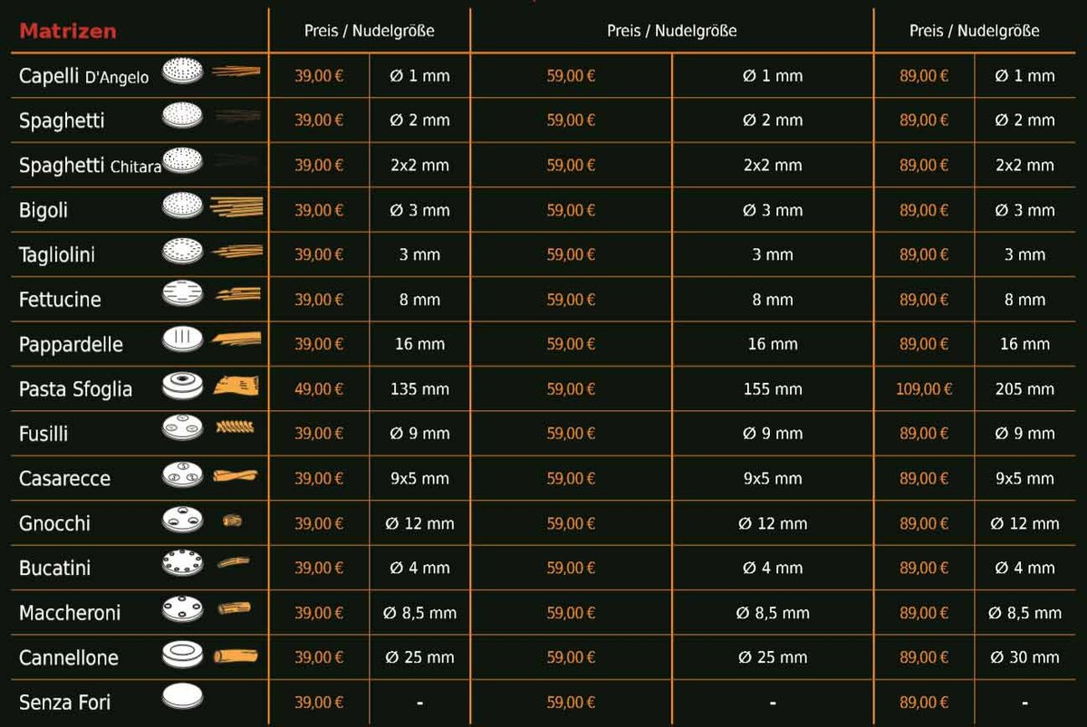 Die Teigzutaten können direkt in die Maschine gegeben werden, wodurch eine vorherige Zubereitung des Teiges nicht mehr notwendig ist. Durch das umfassende Angebot an Matritzen können verschiedenste Nudelsorten problemlos hergestellt werden.