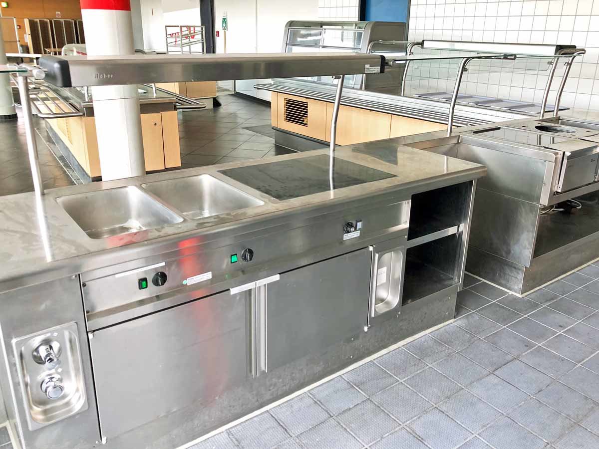 Speiseausgabe-Station Kantine mit Kühlvitrine / Kühltisch / 2x Bain Marie / 2x Aufsatzstrahler / Tellerspender / Varithek / Warmhaltemodul