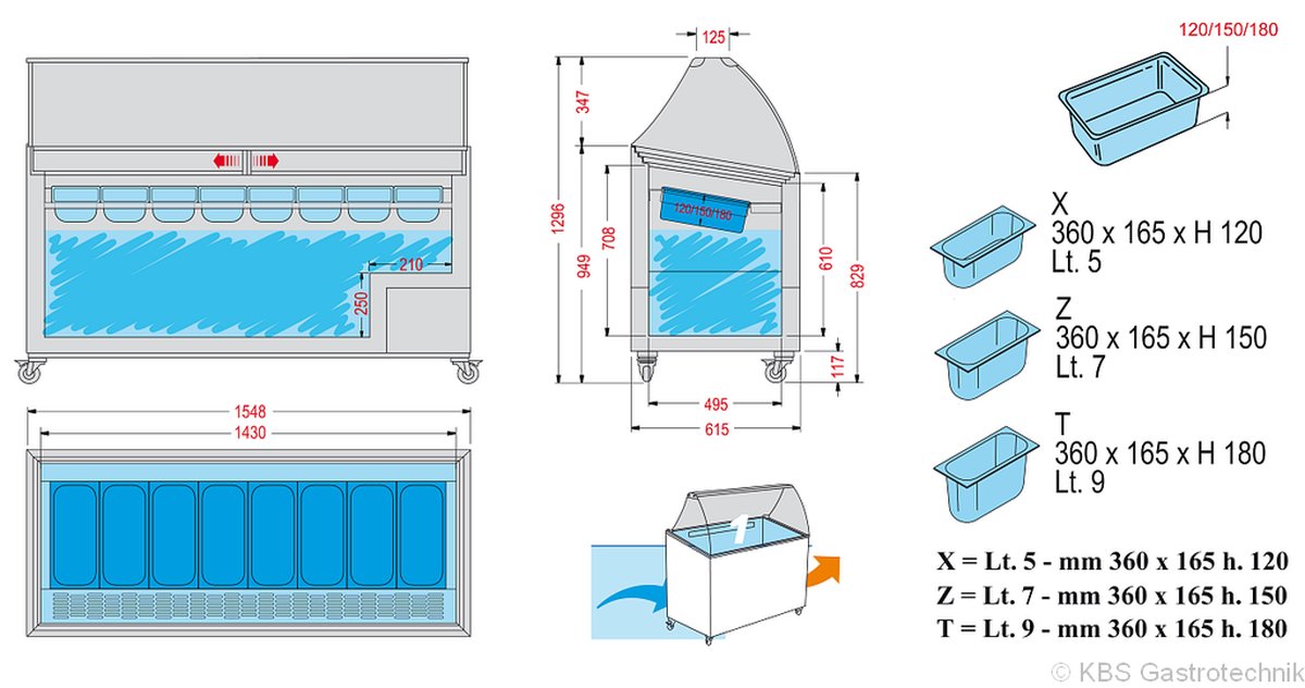 Zahlplatte und integrierter Beleuchtung. Glasaufbau aus Sicherheitsglas zur Selbstmontage bei Anlieferung. Rückwärtige Schiebescheiben mit Schloss. Die Innenwanne eignet sich für Eisschalen bis zu einer Höhe von 180mm.
