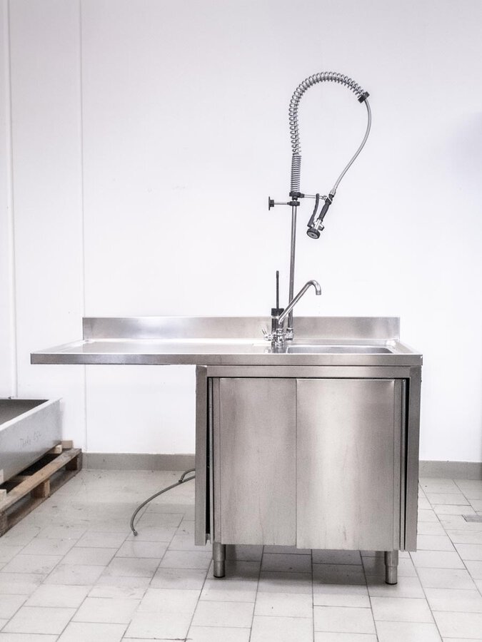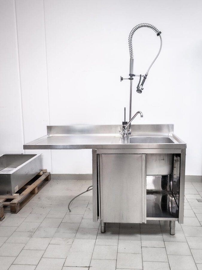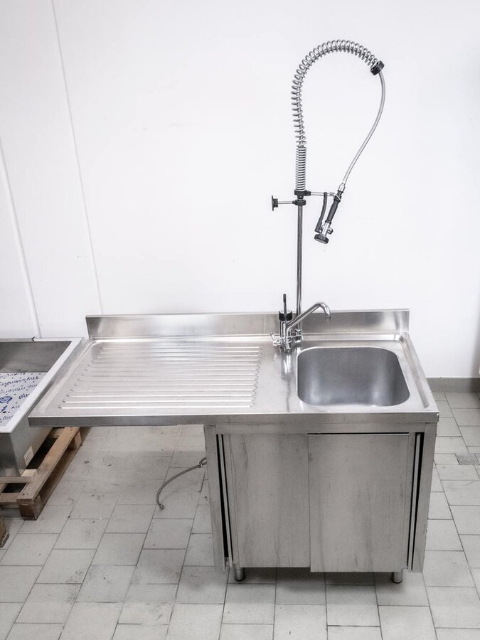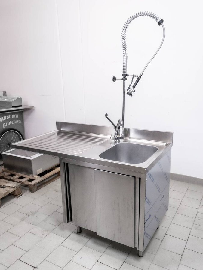 Spülcenter, 1 Becken rechts, 2 Schiebetüren, mit Pendelbrause