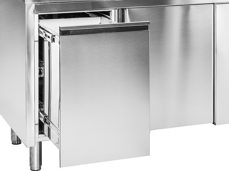 Edelstahl Spülschrank mit 2 Spülbecken rechts und Abfallbehälter - in verschiedenen Breiten