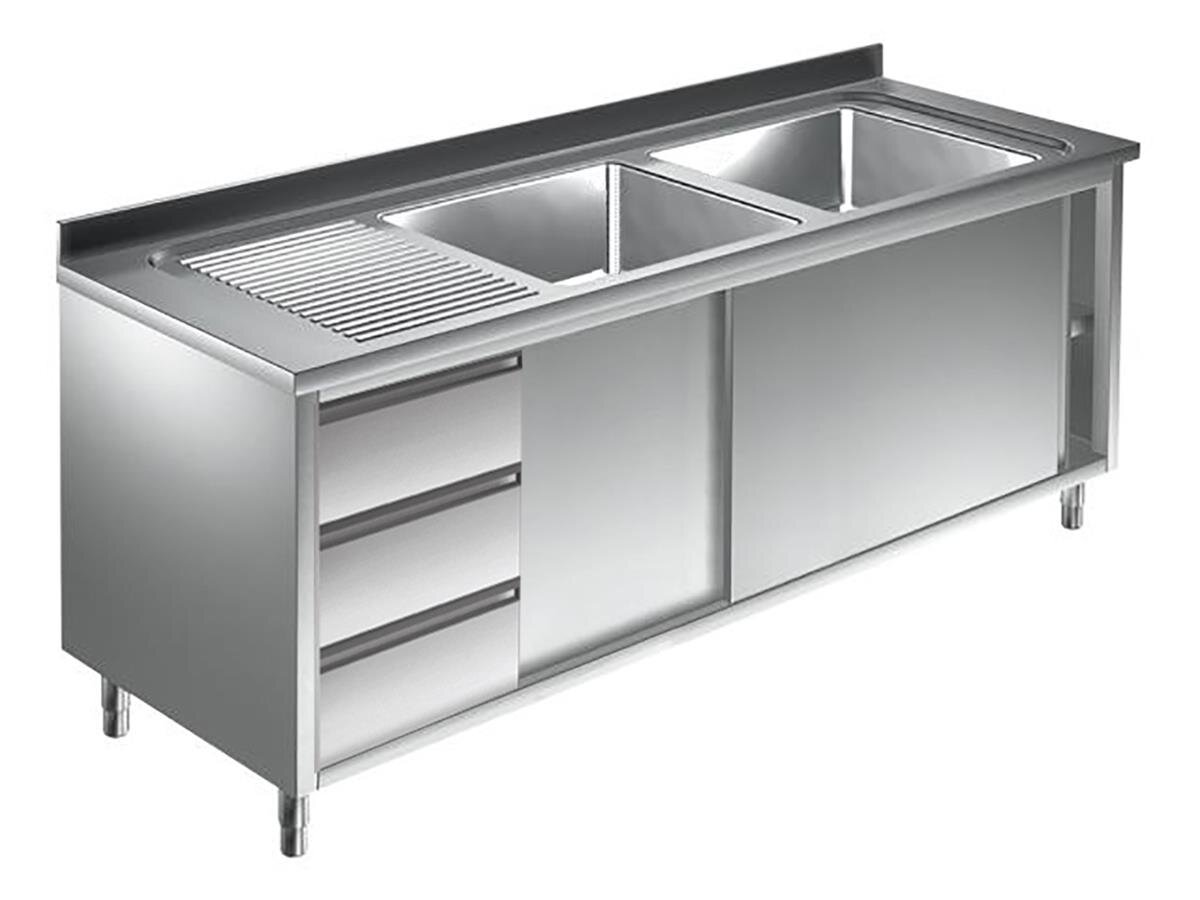 Edelstahl Spülschrank mit Schubladen und Schiebetüren in verschiedenen Breiten