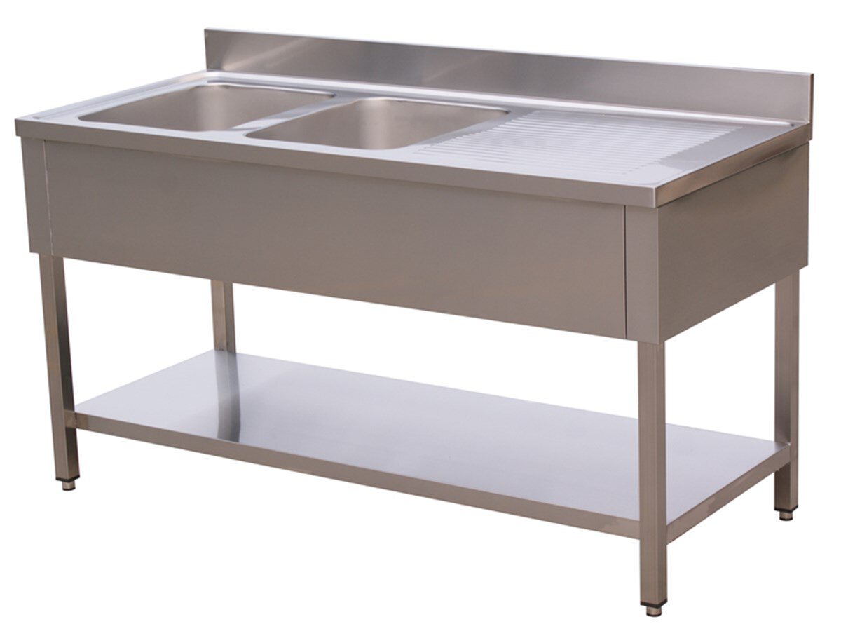 Edelstahl Doppelspültisch mit 2 Becken links und Abtropffläche rechts für Gastronomie