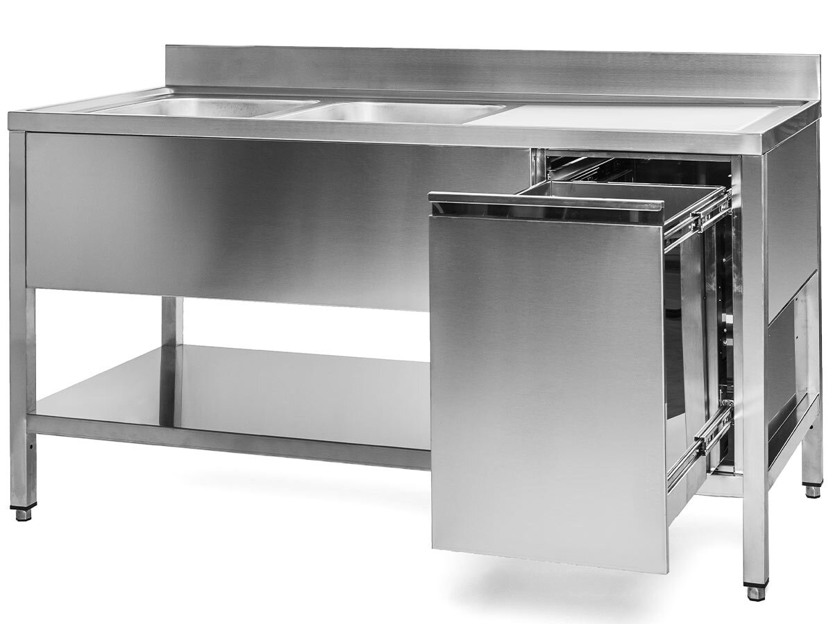 Edelstahl Spültisch mit 2 Spülbecken links und Abfallbehälter - in verschiedenen Breiten