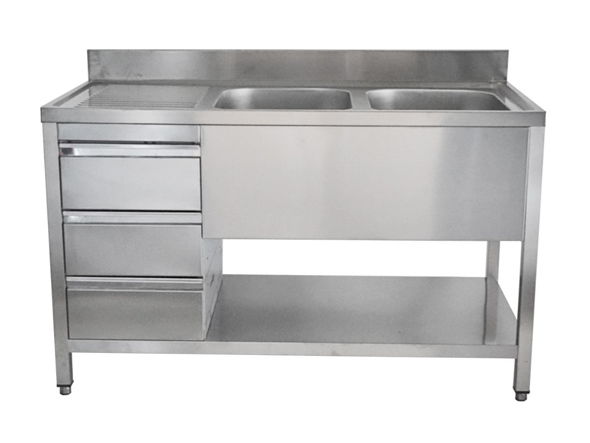Edelstahl Spültisch, 2 Becken rechts, mit Schubladen, Abtropffläche und Aufkantung, Bautiefe 70 cm, verschiedene Breiten