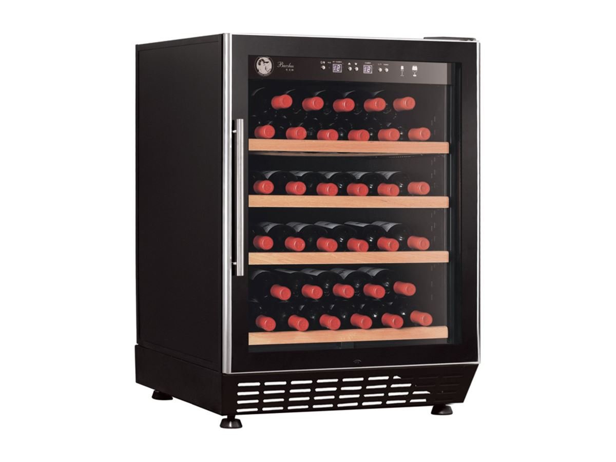 Weinkühlschrank mit Isolierglastür und 1 Temperaturzone. Der Türrahmen und der stabile Türgriff sind verchromt. Die Tür ist abschließbar und verfügt über eine Steckdichtung, die servicefreundlich ohne Werkzeug wechselbar ist. Das Gerät verfügt über 1 elektronisches Steuerpanel mit digitaler Anzeige zur Einstellung der Temperatur von +5°C bis +22°C und eine digitale Anzeige für die Temperatur im Innenraum des Weinkühlschrankes. Die Luftfeuchte im Gerät bewegt sich zwischen 60 und 70 %. Mittels zwei separaten Schaltknöpfen ist die LED-Beleuchtung und das Gerät ein und ausschaltbar. Die Lagerung des Kompressors sorgt für einen leisen und vibrationsfreien Lauf. Ein ideales Gerät zur Präsentation und Lagerung Ihrer Weine.
