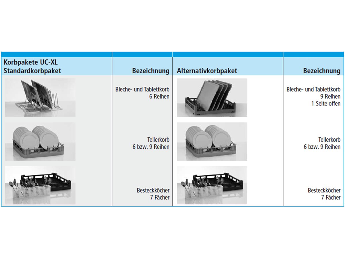 - Alternatives Korbpaket (1x Bleche- und Tablettkorb mit 9 Reihen - eine Seite offen, 1x Tellerkorb mit 6 bzw. 9 Reihen, 1x Besteckköcher mit 7 Fächern)